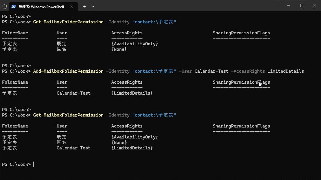 下記のコマンドでユーザーごとの予定表権限を確認します。